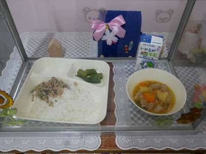 今日の給食の献立は、「ごはん、牛乳、豚肉とじゃがいもの煮もの、オクラの梅風味、ツナっ葉炒め」でした。