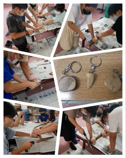 伐採した枝をノコギリで切り取ってヤスリで磨き、金具を付けたら世界に一つだけのキーホルダーの出来上がりです。