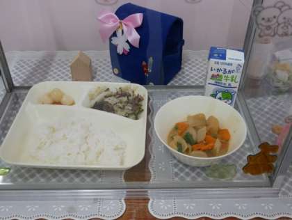 今日の給食は、「ごはん、牛乳、ひと口がんもと里芋の味噌煮、牛肉と野菜の炒めもの、みたらし団子」でした。