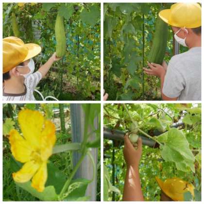 5年生の学習園では、立派なへちまの実がたくさんできています。