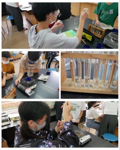 6年は、理科の「水よう液の性質」の学習で試験管に入っている食塩水、炭酸水、うすい塩酸、重曹水、うすいアンモニア水の性質を実験をして調べました。