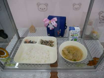 今日の給食は、「ごはん、牛乳、鮭のつけ焼き、五目汁、高野豆腐の炒り煮」でした。