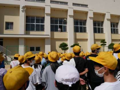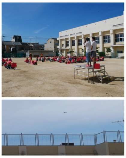 今日は、全校児童が運動場に集まり、校名の「東小路」の人文字を作って空から撮影しました。また、体育館のギャラリーから全校児童で記念写真を撮りました。