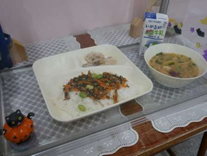 今日の給食は、「ごはん、牛乳、もずくと豚挽肉のジューシー、さつまいものみそ汁、焼きレンコン」でした。