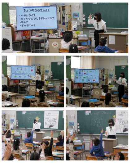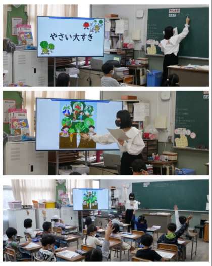 1年生は、出前授業で栄養教諭の方から「やさい大すき」というテーマで栄養指導をしていただきました。