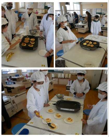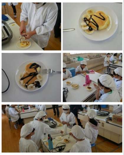 こんがりきつね色で、上手に焼けました。バナナをトッピングして、シロップをかけて完成です。盛り付けもきれいにできました。