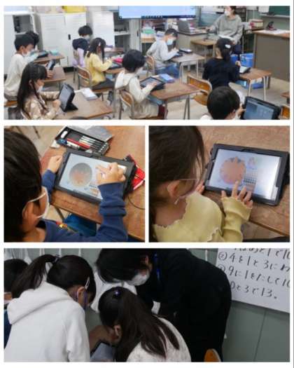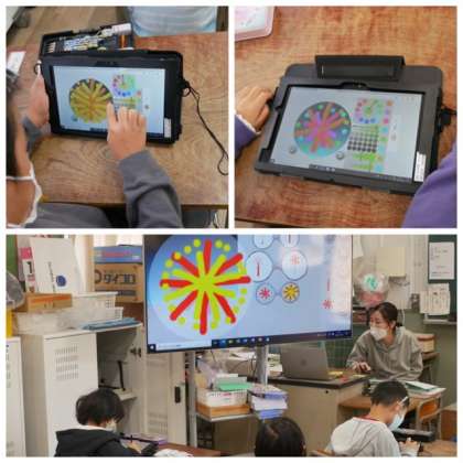 一人一台学習者端末のビスケットというアプリを使って花火が上がって、円形に広がっていくプログラミングをしました。