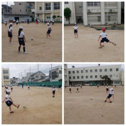2年生は、体育科でボールけり遊びをしました。グループで輪になってパスをし合いました。