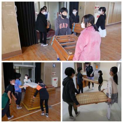 土曜日の作品展に備えて、体育館に置いている跳び箱やマットを5年生の手を借りて片付けました。