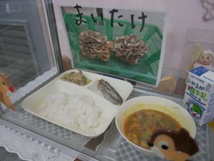 今日の給食は、「ごはん、牛乳、焼きししゃも、和風カレー汁、まいたけとキャベツの炒めもの」でした。