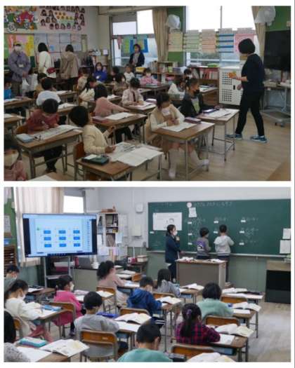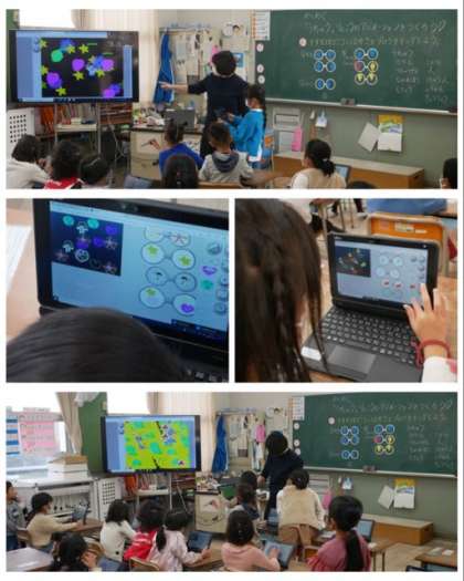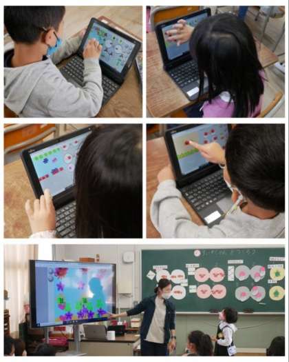 1年生は、算数科でひき算の学習と一人一台学習者端末のプログラミングのアプリを使って、宇宙旅行や水族館のアニメーション作りに挑戦しました。アニメーションは、1年生とは思えないぐらいの素晴らしい出来ばえでした。
