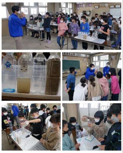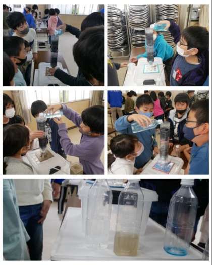 砂や活性炭でろ過をして、濁っていた淀川の水が透明の水に変化する様子を実際に実験をして確かめました。この実験を通して浄水場の仕組みを理解することができました。