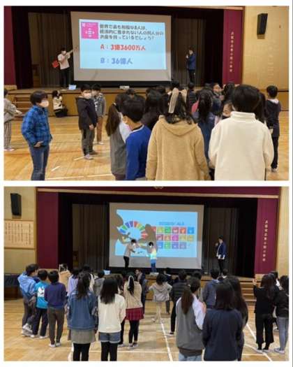 5年生は、生野区の生きるチカラ学びサポート事業で、よしもとの漫才コンビ「チャイルドプリンス」さんに来ていただき、SDGs(持続可能な開発目標)について、漫才やクイズを通じて楽しく学習しました。
