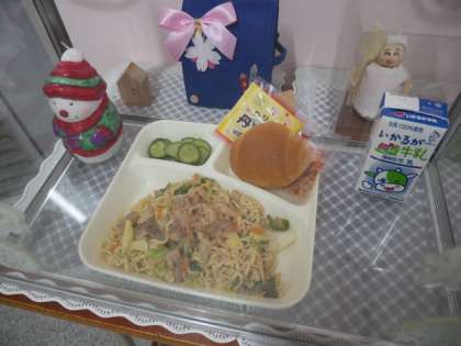 今日の給食は、「黒糖パン(1/2)、牛乳、和風焼きそば、きゅうりの生姜漬け、炒り黒豆)でした。