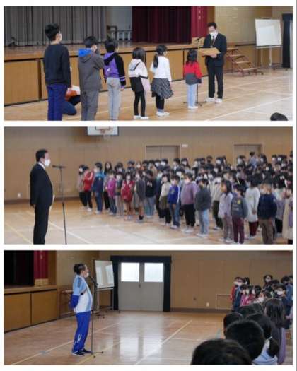 学校長からは、まず、読書感想文コンクールで受賞した人の表彰式を行いました。