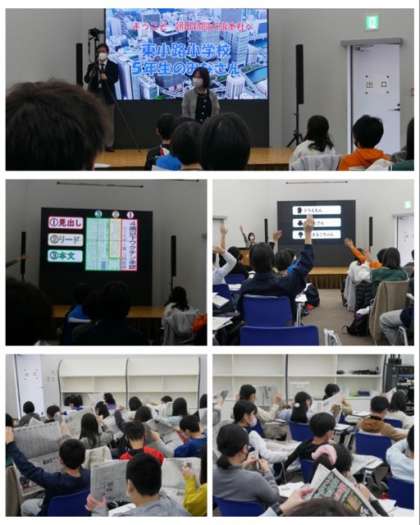 説明会場では、新聞記者の取材から新聞が家に届くまでの過程をプレゼンや映像で詳しく説明していただきました。子どもたちは、説明をよく聴き、熱心にメモを取っていました。