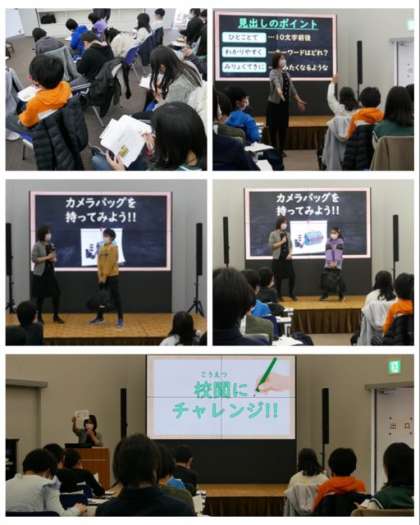 説明を聴くだけではなく、新聞記事の見出しを考えたり、記事の校閲の体験をしたりしました。また、代表児童が15kgもあるカメラ機材を入れたカバンの重さを実際に持って体験したり、クイズに答えたりしながら楽しく学習できました。