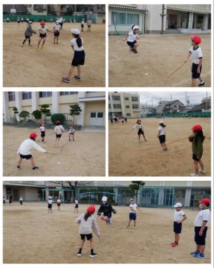 2年生は、体育会の学習でグループに分かれて長縄跳びをしたり、短縄跳びをして体を動かしました。