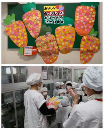 いつもおいしい給食を作ってくださっている給食調理員さんに感謝の気持ちを込めて、「ありがとう、にんじん」にメッセージを書いて掲示しています。また、全校児童を代表して1年生が給食調理員さんにお手紙を手渡しました。
