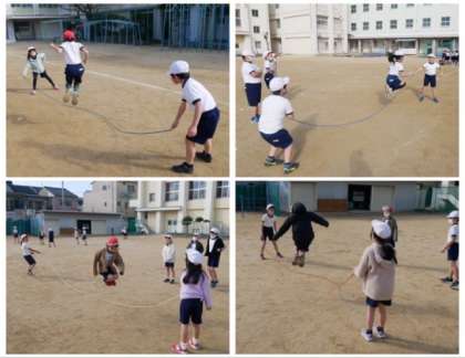 体育科では、グループになって長なわとびを「ゆうびんやさん」の歌に合わせて順番に跳んでいました。