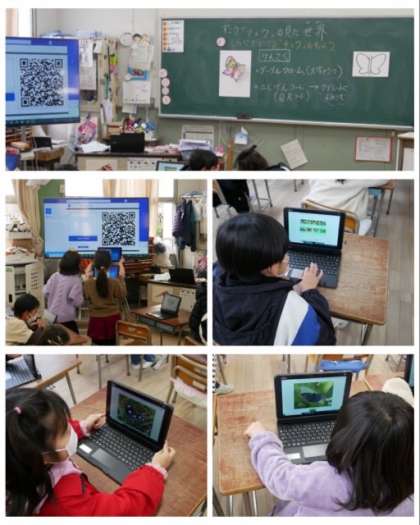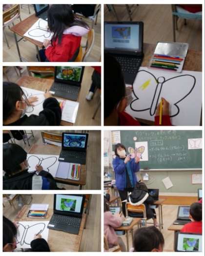 1年生は、「しらべてかこうチョウのもよう」をテーマにして、まず二次元(QR)コードを読み取り、グーグルクロームを使って気に入った模様の蝶を探して、色鉛筆で色を付けていきました。どんな蝶が出来上がるのか楽しみです。