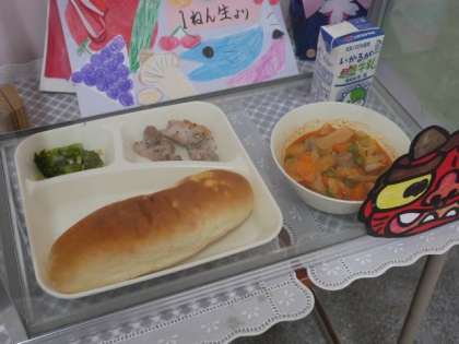 今日の給食は、「おさつパン、牛乳、鶏肉のバジル焼き、ウインナーと野菜のケチャップ煮、ブロッコリーのサラダ」でした。鶏肉のバジル焼きは、肉厚で食べ応えがあっておいしかったです。