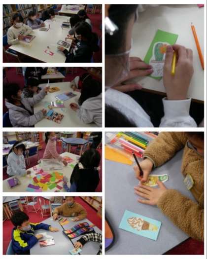 ぬり絵を楽しみながら、手作りのしおりを借りた本にはさみます。読書週間中に、たくさん本を読んでほしいです。