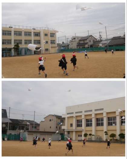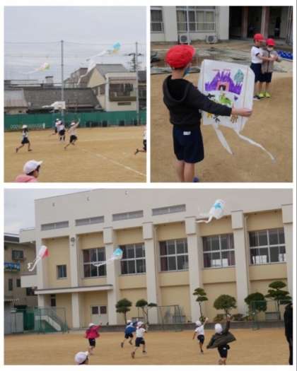 1年生は、思い思いの絵を描いた凧を運動場で飛ばしました。あまり風が吹いていませんでしたが、勢いよく走ると、凧はすうーっと舞い上がっていきました。