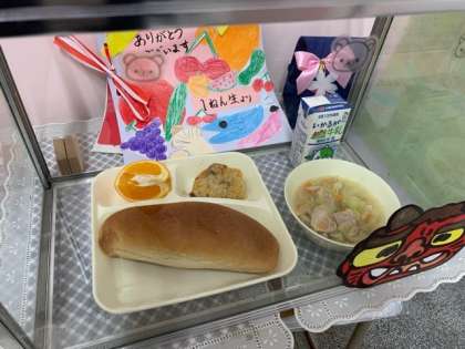 今日の給食は、「黒糖パン、牛乳、押麦のグラタン、豚肉と野菜のスープ、いよかん」でした。押麦のグラタンは、押麦がしっとりしてボリュームたっぷりでおいしかったです。