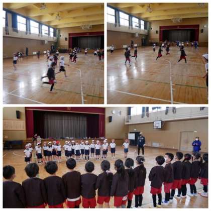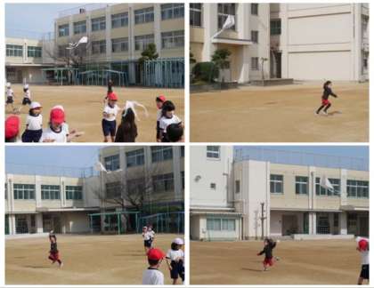 一通り校舎見学をした後、1年生と鬼ごっこをしたり、たこあげをしたりして遊びました。