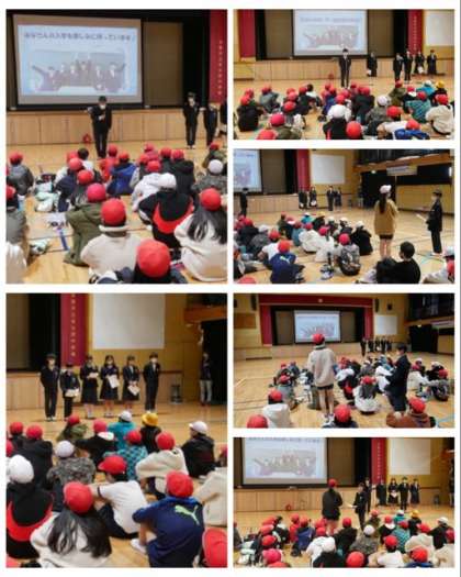 まず、体育館で生徒会の人たちから中学校生活についてのプレゼンテーションを聞きました。