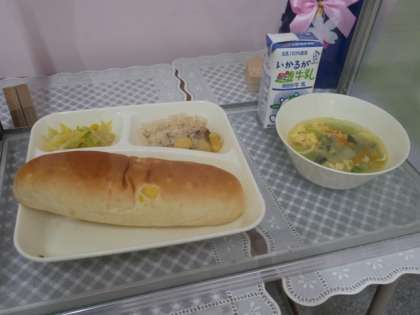 今日の給食は、「おさつパン、牛乳、中華おこわ、卵スープ、キャベツのオイスターソース炒め」でした。中華おこわは、もちもちしていて具がたっぷり入っていておいしかったです。