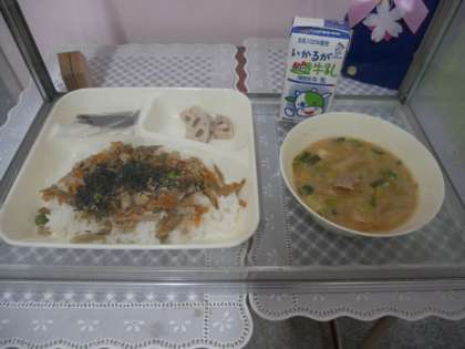 今日の給食は、「ごはん、牛乳、鶏ごぼう飯、とうふのみそ汁、焼きれんこん」でした。焼きれんこんは、サクサクだけどもっちりとした食感がよかったです。