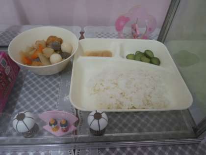 今日の給食は、「ごはん、牛乳、関東煮、きゅうりの梅風味、白花豆の煮もの」でした。関東煮は、具材がやわらかく煮込まれて味がしみていておいしかったです。