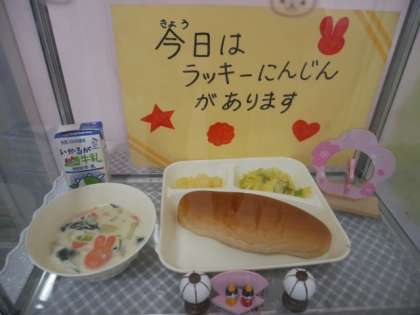 今日の給食は、「黒糖パン、牛乳、ほうれん草のクリームシチュー、キャベツのサラダ、洋梨(カット缶)」でした。ほうれん草のクリームシチューには、うさぎの形をしたラッキーニンジンが入っています。さて、今日のラッキーさんは、誰だったでしょうか。