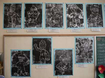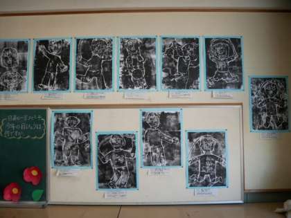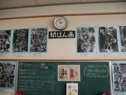 2年の教室には、図画工作科で作成した紙版画を掲示しています。とても躍動感のある作品です。
