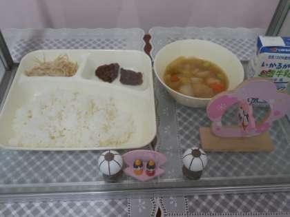 今日の給食は、「ごはん、牛乳、くじらのオーロラ煮、まる天と野菜のうま煮、もやしのピリ辛和え」でした。くじらのオーロラ煮は、甘辛く味付けされていておいしかったです。給食委員会では、今日のメニューを壁新聞で紹介しています。