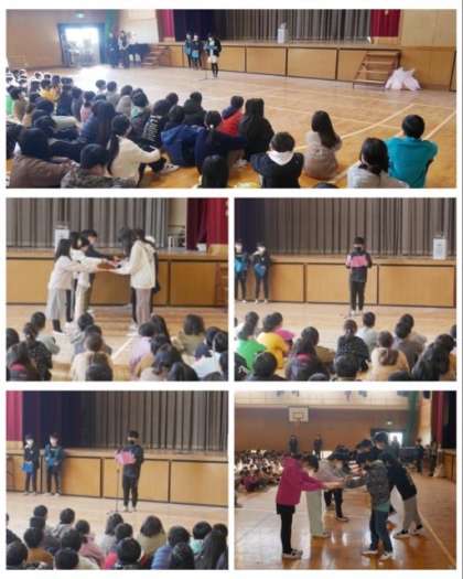 はじめに、在校生から卒業生一人一人へお祝いメッセージのプレゼントをし、卒業生から在校生へは、ぞうきんのプレゼントをそれぞれの学級に渡しました。