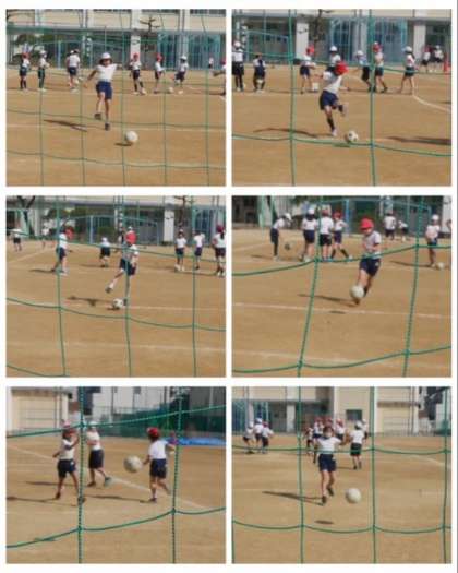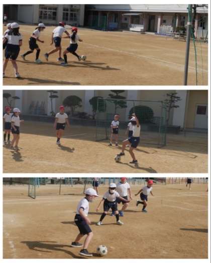 3年生は、体育科でサッカーの学習をしています。シュートの練習や、チーム内で3対3のミニゲームをしてパスをつなぐ練習をしています。