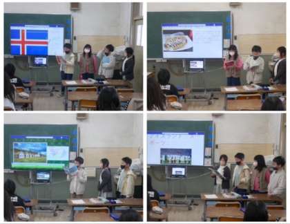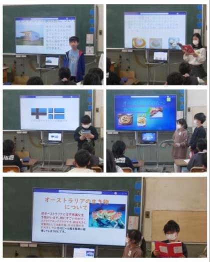 3年生は、国語科の「外国のことをしょうかいしよう」の学習で、グループで調べた外国の国旗や食べ物、家などについてスライドショーにまとめたものを発表しました。
