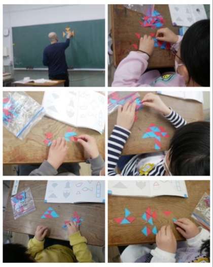 算数科では、三角形の色板を敷き詰めて教科書に載っている形と同じ形を作りました。そのうち、クリスマスツリーなど、自分でアレンジして敷き詰めていきました。
