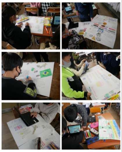 3年生は、国語科「外国のことをしょうかいしよう」の学習で、一人一台端末で各国の人口や名所、食べ物などを調べてグループで壁新聞を作成しています。クイズコーナーなどがあり、楽しみながらその国のことを知ることができるように工夫しています。