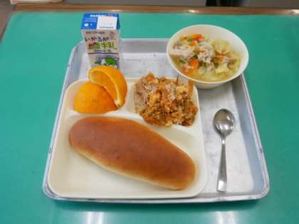 今日の給食は、「黒糖パン、牛乳、豆腐のミートグラタン、押麦と野菜のスープ煮、デコポン」でした。豆腐のミートグラタンは、豆腐とは思えないぐらいのおいしさでした。
