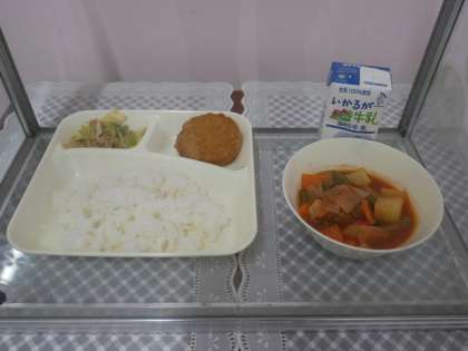 今日の給食は、「ごはん、牛乳、チキンレバーカツ、ケチャップ煮、ツナとキャベツのバジルソテー」でした。チキンレバーカツは、カリッと揚げられていておいしかったです。