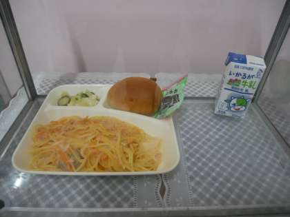 今日の給食の献立は、「黒糖パン(1/2)、牛乳、鮭のクリームスパゲッティ、キャベツときゅうりのサラダ、ソフト黒豆」でした。