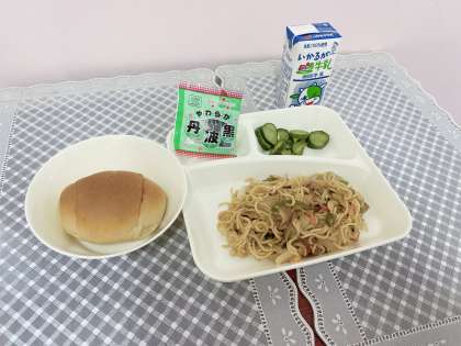 今日の献立は、焼きそば.きゅうりのしょうがづけ.ソフト黒豆.黒糖パン.牛乳です。