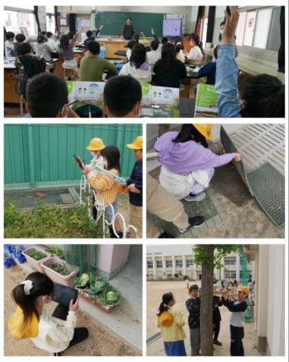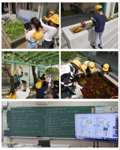 4年生は、理科「春の生き物」の学習で学校に咲いている草花や虫を探して、一人一台学習者用端末のカメラ機能を使って記録しました。