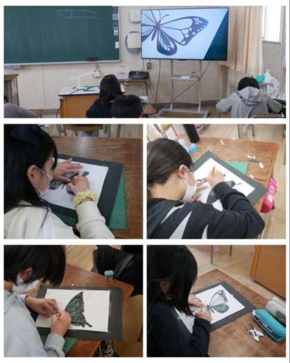 6年生は、チョウの切り絵に挑戦していました。慎重に繊細にカッターを使って切り抜いていました。
