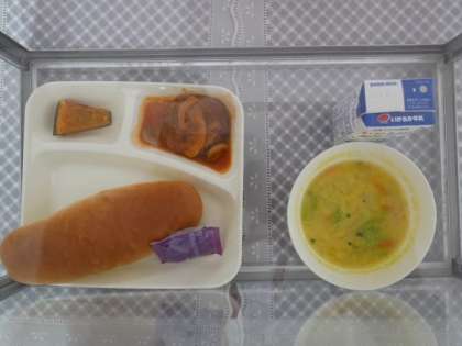 今日の給食は、コッペパン、牛乳、煮込みハンバーグ、コーンとキャベツのスープ、焼きかぼちゃ、ブルーベリーです。