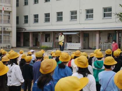 4月24日(月)の全校朝会では、生野区役所の地域まちづくり課の担当の方が来校し、子どもたちの見守りについて、青パトで巡回していることや、いざというときのために「こども110番」の家を日頃からチェックしておきましょうというお話をされました。